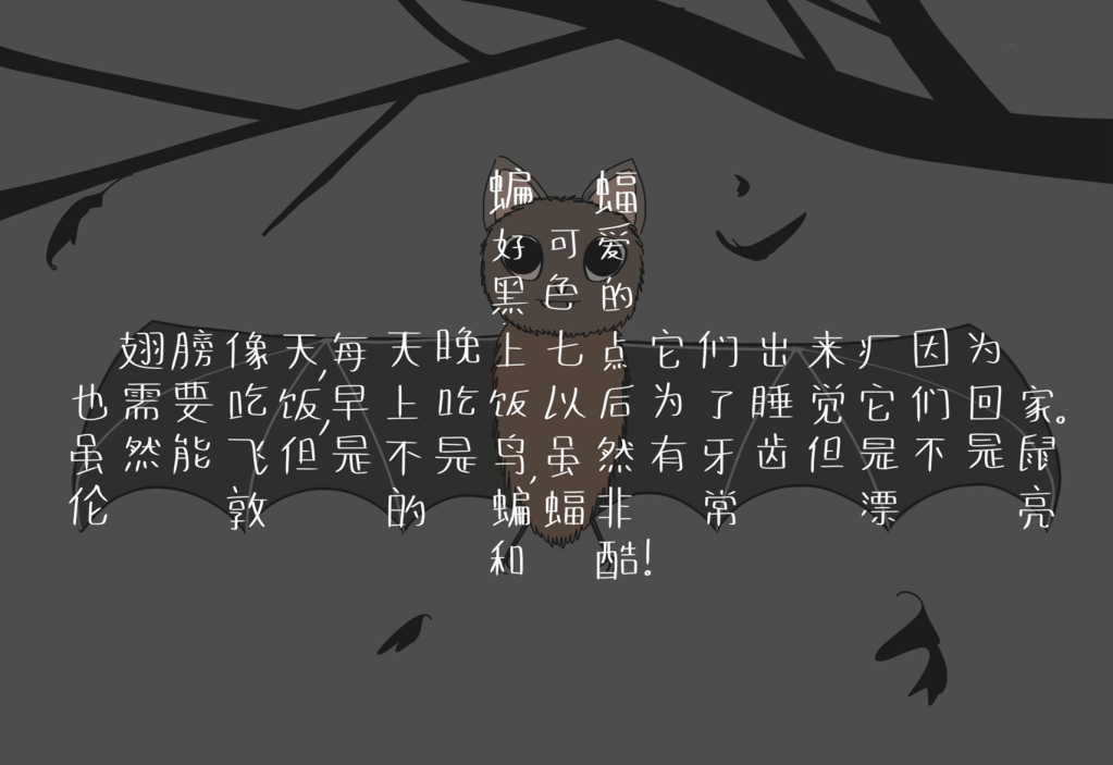 Biānfú hǎo kě'ài hēisè de chìbǎng xiàng tiān, měitiān wǎnshàng qī diǎn tāmen chūlái fēi yīnwèi yě xūyào chīfàn, zǎoshang chīfàn yǐhòu wèile tāmen shuìjiào huí jiā. Suīrán néng fēi dànshì bùshì niǎo, suīrán yǒu yáchǐ dànshì bùshì shǔ lúndūn de biānfú fēicháng piàoliang hé kù!