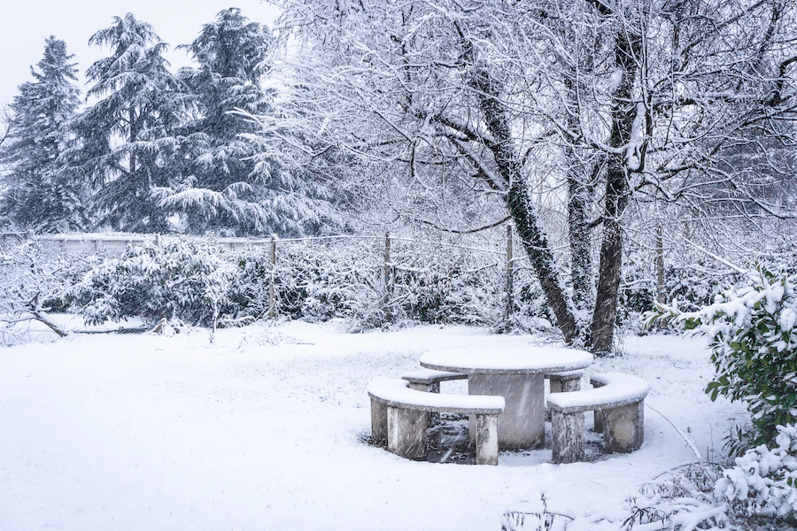 February. I’m starting to grow my leaves, but there’s no one outside to appreciate them. It’s as if the world is in black and white; the sky is cloudy and the ground is covered in snow, while the houses in the distance look dark. The little boy has started school again, so the garden is lonelier than before.