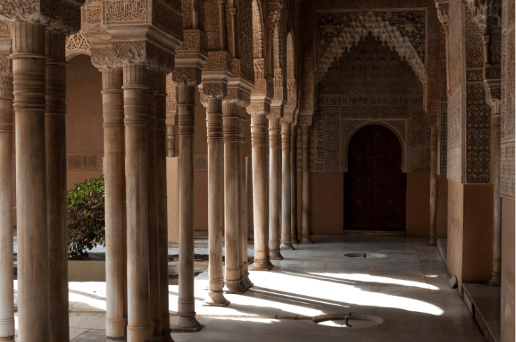From as far back as the 7th century, many Islamic Empires, such as the Umayyad Caliphate and the Caliphate of Córdoba expanded the influence of the Islamic World to Spain. Islamic architecture became a prominent feature there, including horseshoe arches, geometrical designs, and intricate decorations. Some of the most famous examples of Moorish architecture are situated in Andalusia in the south of Spain, including the Alhambra in Granada, Real Alcázar of Seville, and the Mezquita in Córdoba.